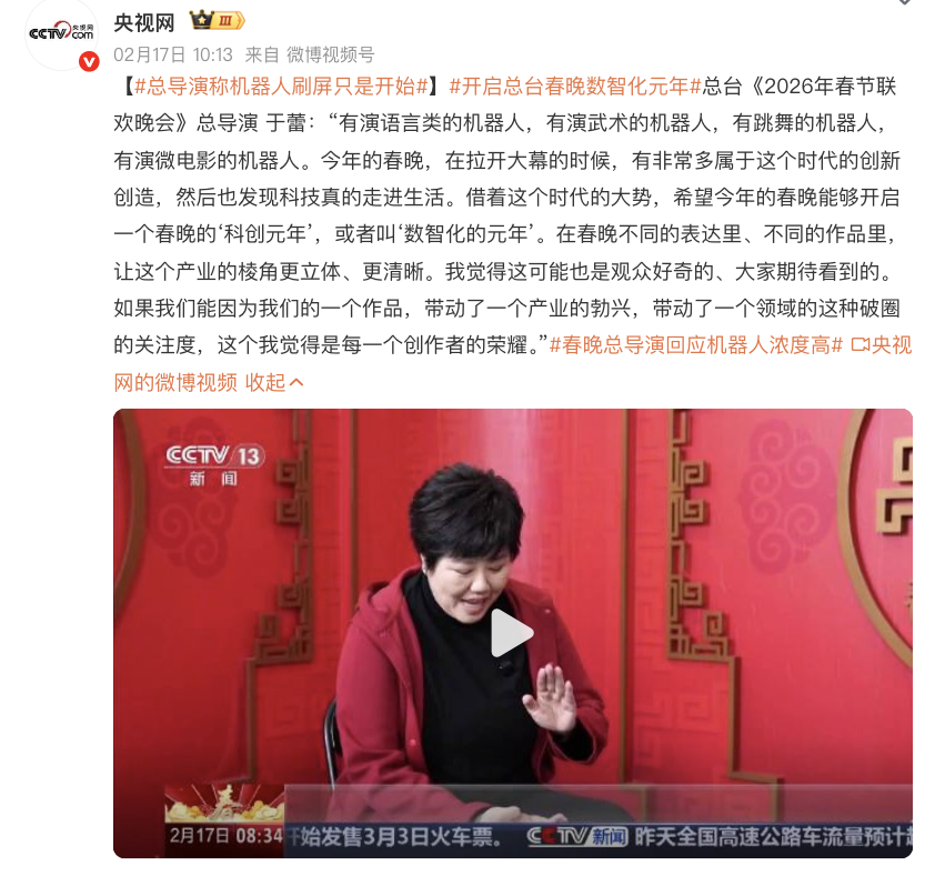总台《2026年春节联欢晚会》总导演于蕾:“有演语言类的机器人,有演武术的机器人,有跳舞的机器人,有演微电影的机器人。今年的春晚,在拉开大幕的时候,有非常多属于这个时代的创新创造,然后也发现科技真的走进生活。